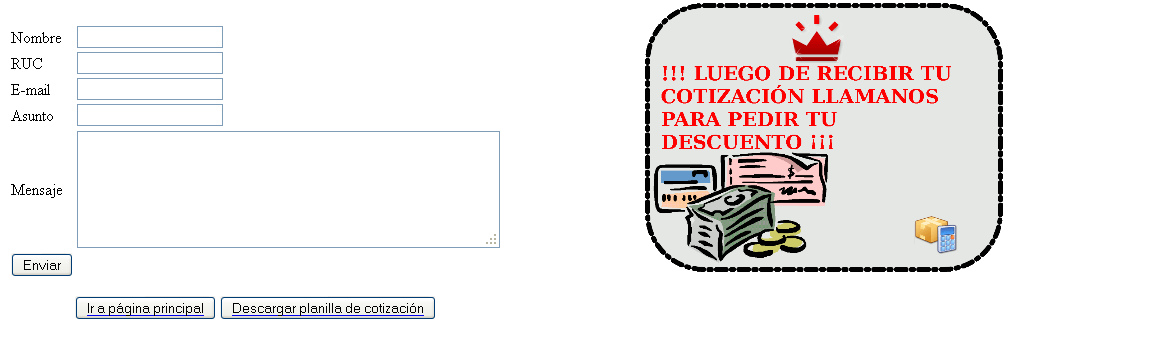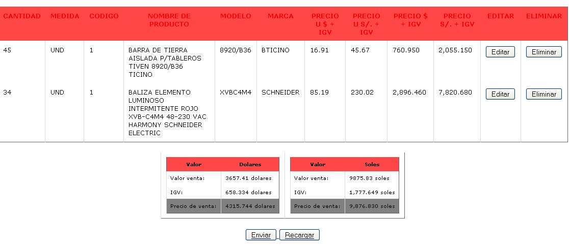 lista. En la parte de abajo de la página verán otras dos opciones un botón "enviar" que lo dirigirá a un formulario para que llene sus datos y envío la cotización a la empresa y a usted (vía correo). También un botón "recargar" que actuliza la página para ver los cambios realizados. |